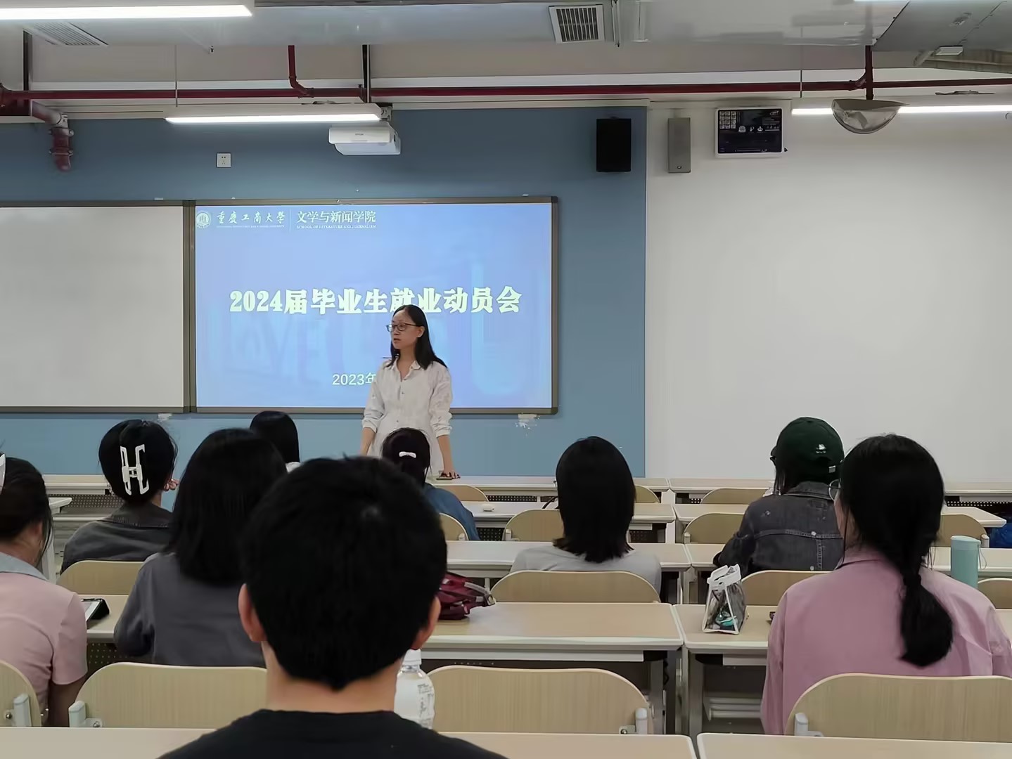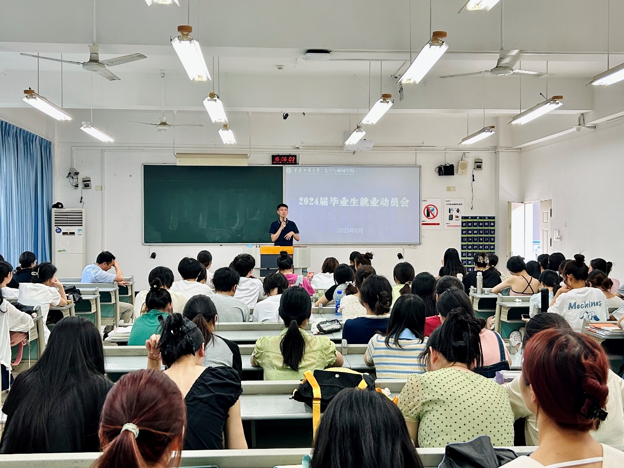 汉语言文学系于慧智楼90624教室召开就业推进会,系主任周之涵老师指出,作为准大四员工应早日将就业问题提上计划日程,即使是考研、考公的员工也要做好两手准备,在全力备考的同时还要留好退路;此外,周老师就员工思想转变问题提出建议:大四员工已经半只脚踏入了社会,应尽早走出象牙塔,转变自己的思维方式,做好踏入社会的准备。王彦杰老师为同学们做个人经验分享和建议,他从利用网络资源等多途径了解就业招聘信息、学会适应顿感力、广撒网式地投递简历等方面做出了讲解;另外,王老师还提出,在毕业论文方面,员工应该主动联系导师,提前构建好论文框架,帮助员工们做出更为合理的毕业论文规划。
