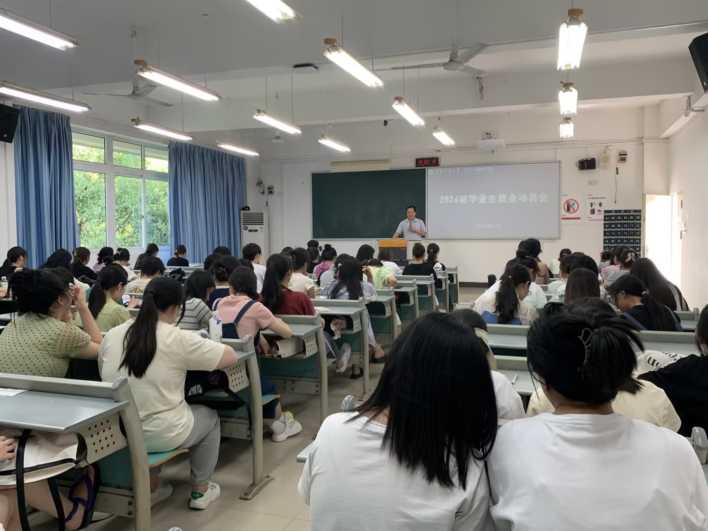 新闻系于涵智楼905教室召开2024届毕业生就业推进会,副经理郑笑眉、新闻系专任教师邵茹波参会。郑经理从自身实际出发,向同学们分享了她的就业经历,并叮嘱同学们“要明白自己在做什么,不要光想,要去做”。邵老师就具体就业形势、就业渠道展开分享,积极回应同学们关注的问题,鼓励同学们勇于就业,积极就业。
