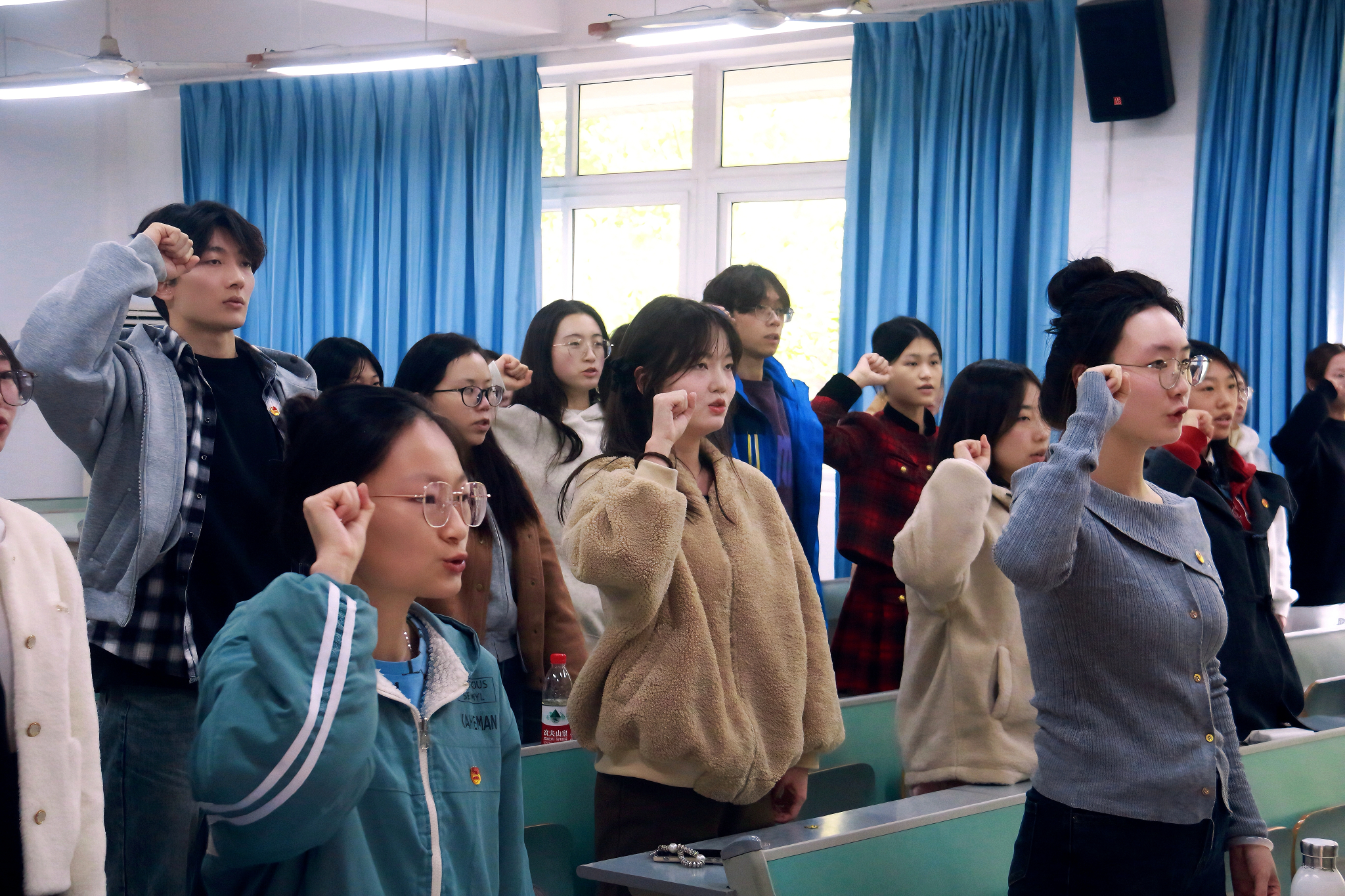 入团仪式在庄严的国歌声中拉开帷幕。主持人宣读新发展团员名,并向新发展团员们表示热烈的祝贺。随后,优秀团员代表文林为九位新团员代表佩戴团徽、颁发团章和团员证,并在刘平的带领下庄严宣誓。