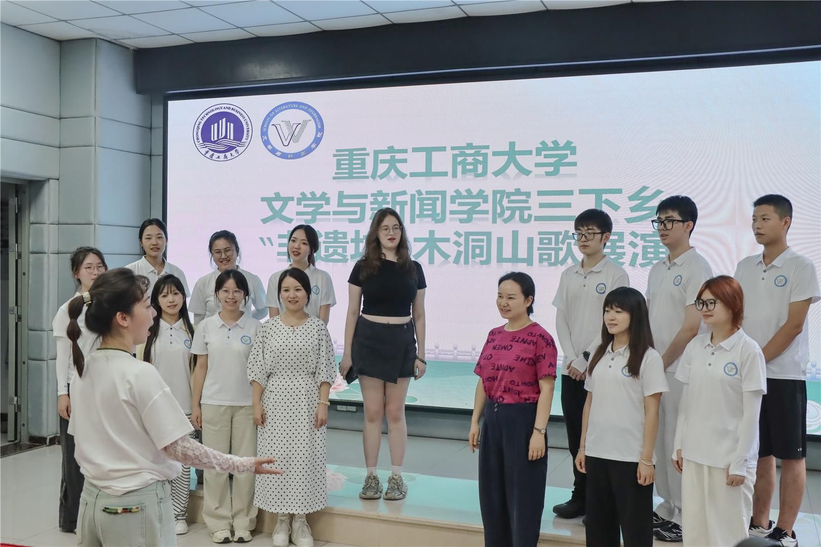 随后,传承团来到木洞镇文化服务中心学唱木洞山歌《什么红来红满天》。师生们通过分组练习,很快掌握了基本的演唱要领。传承团还集体排练了《唱支山歌给党听》《我的祖国》等经典曲目,在歌声中抒发爱国情怀。