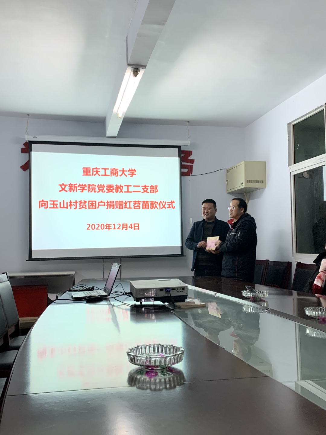 刘代成向大家简要介绍了玉山村村情、支部党建工作和脱贫攻坚成效。李华平代表公司分党委表达了对玉山村精准扶贫及乡村发展的关心与支持,邵茹波将教工二支部党员的扶贫自愿捐款3660元交给玉山村的贫困村民购买红薯秧苗。