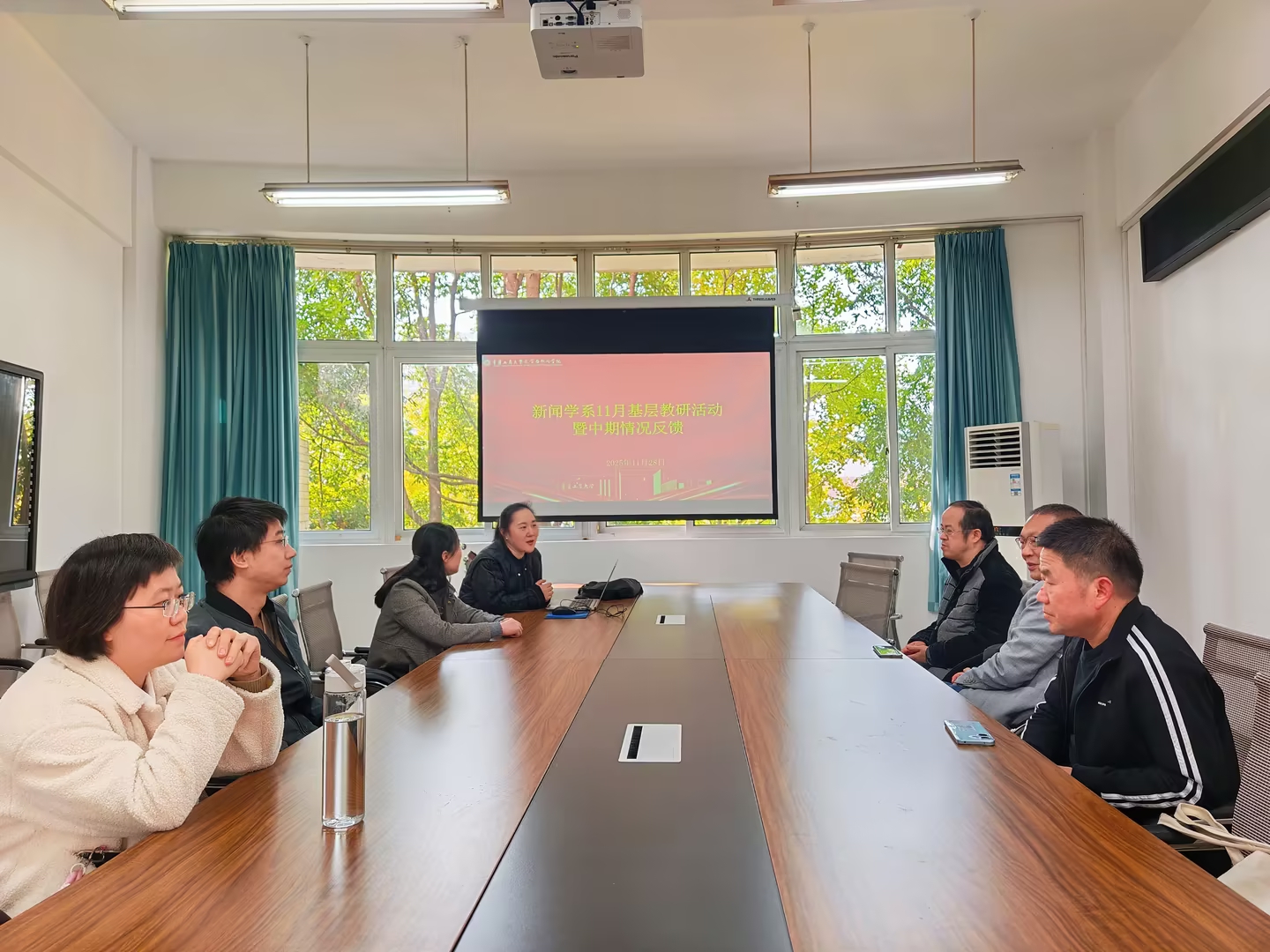 2025年11月28日下午,新闻学系11月基层教研活动暨中期情况反馈会在慧智楼90528教室召开。会议由系主任廖宇翃主持,全系教师参加。