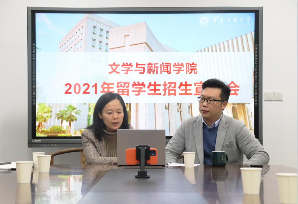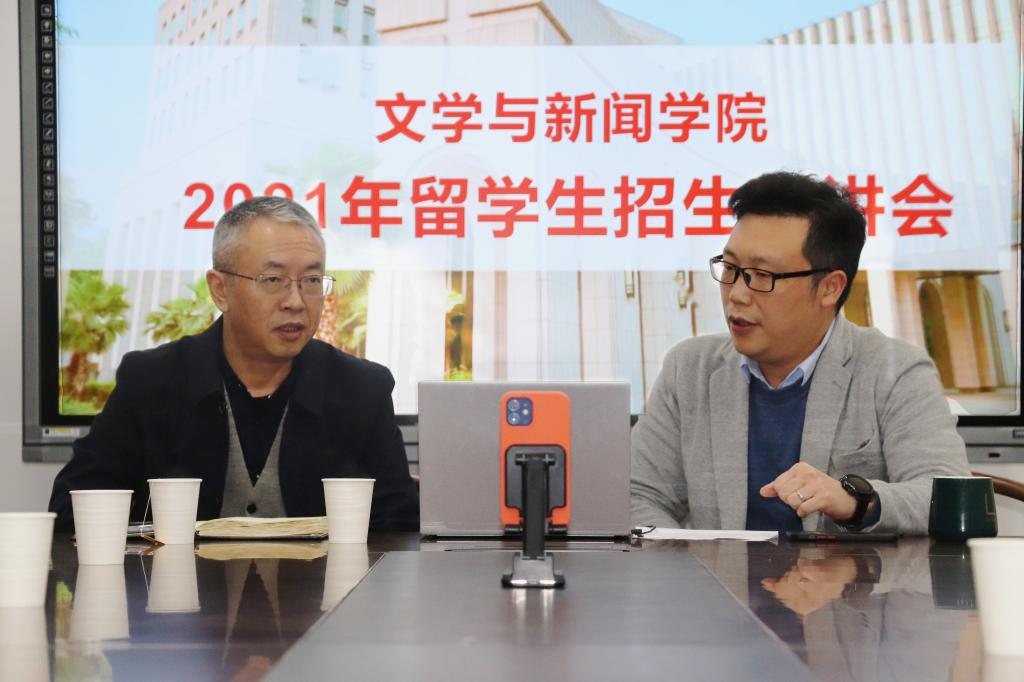 2021年4月6日下午14:30,公司在涵智楼801会议室举办了2021年外国职工招生宣讲会。在国际合作与交流处的协助下,本次宣讲会采用网络直播形式。经理王仕勇、广播电视学系系主任王瑞林进行现场直播宣讲,职工辅导员周晋协助直播。国际合作与交流处副处长陈昌盛和刘茜、宋旭等老师出席宣讲会,并对相关问题进行协助答疑。宣讲会由国际合作与交流处副处长陈昌盛主持,吸引了有志于报考公司硕士阶段学习的职工通过视频实时在线积极参与。