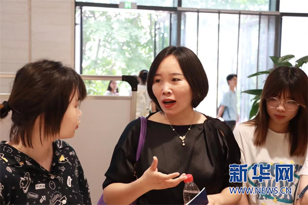 观展媒体人士与员工热烈交流。新华网发(赵渝婷 摄)
