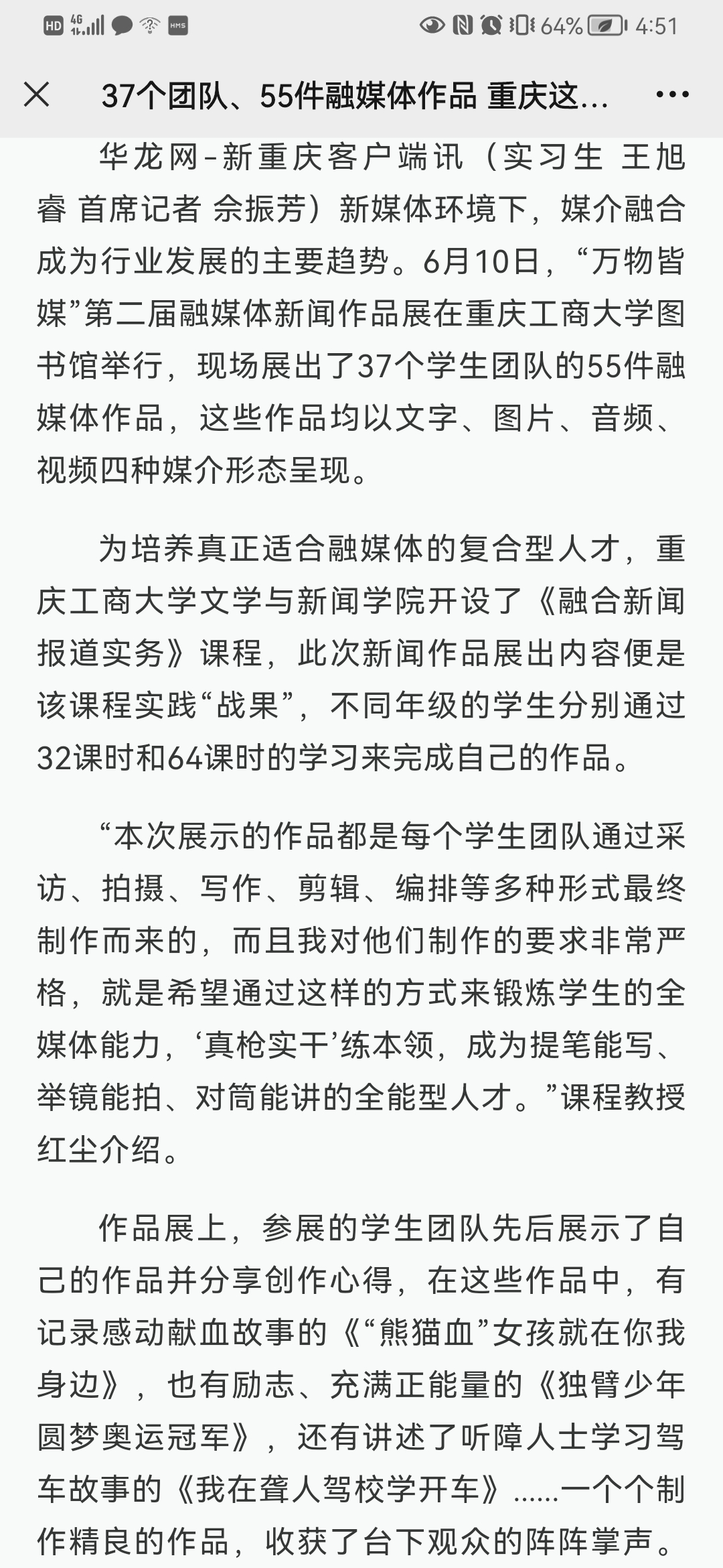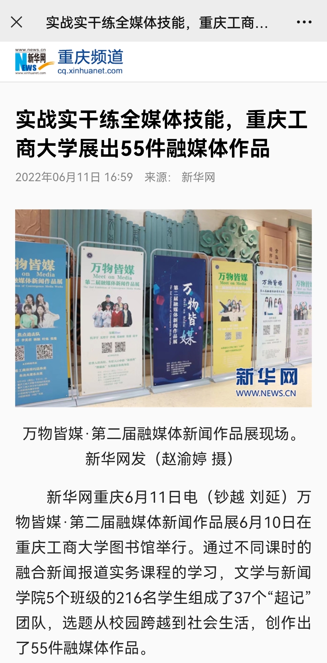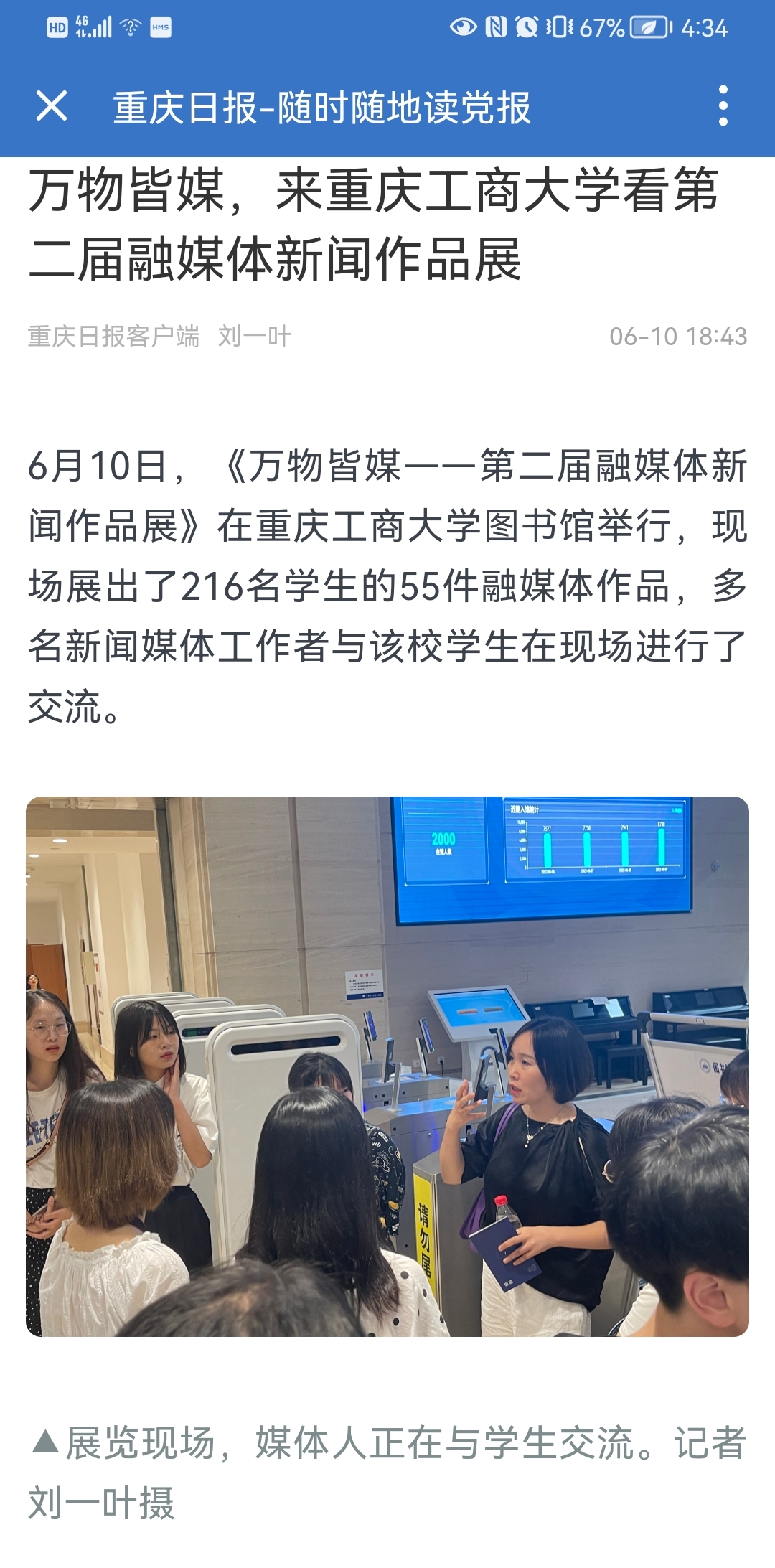 近日,重庆日报、新华网重庆频道等近10家媒体报道公司tyc5997太阳集团万物皆媒·第二届融媒体新闻作品展。6月10日,重庆日报以“万物皆媒,来tyc5997太阳集团看第二届融媒体新闻作品展”为题报道公司tyc5997太阳集团万物皆媒·第二届融媒体新闻作品展。6月10日,华龙网-新重庆客户端以“37个团队、55件融媒体作品 重庆这所高校让员工“真枪实干”练本领”为题报道公司tyc5997太阳集团万物皆媒·第二届融媒体新闻作品展。6月10日,新华网以“实战实干练全媒体技能,tyc5997太阳集团展出55件融媒体作品”为题报道公司tyc5997太阳集团万物皆媒·第二届融媒体新闻作品展。 6月10日,上游新闻以“万物互媒—第二届融媒体新闻作品展,55件作品展示当代老员工创作实力”为题报道公司tyc5997太阳集团万物皆媒·第二届融媒体新闻作品展。6月10日,今日头条、网易、澎湃新闻、新浪新闻等媒体均以“实战实干练全媒体技能,tyc5997太阳集团展出55件融媒体作品”为题进行转载报道。