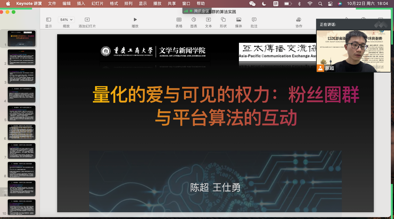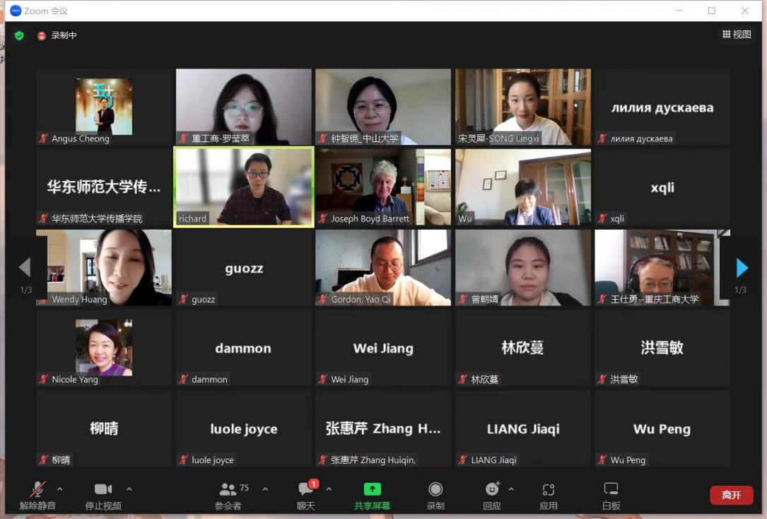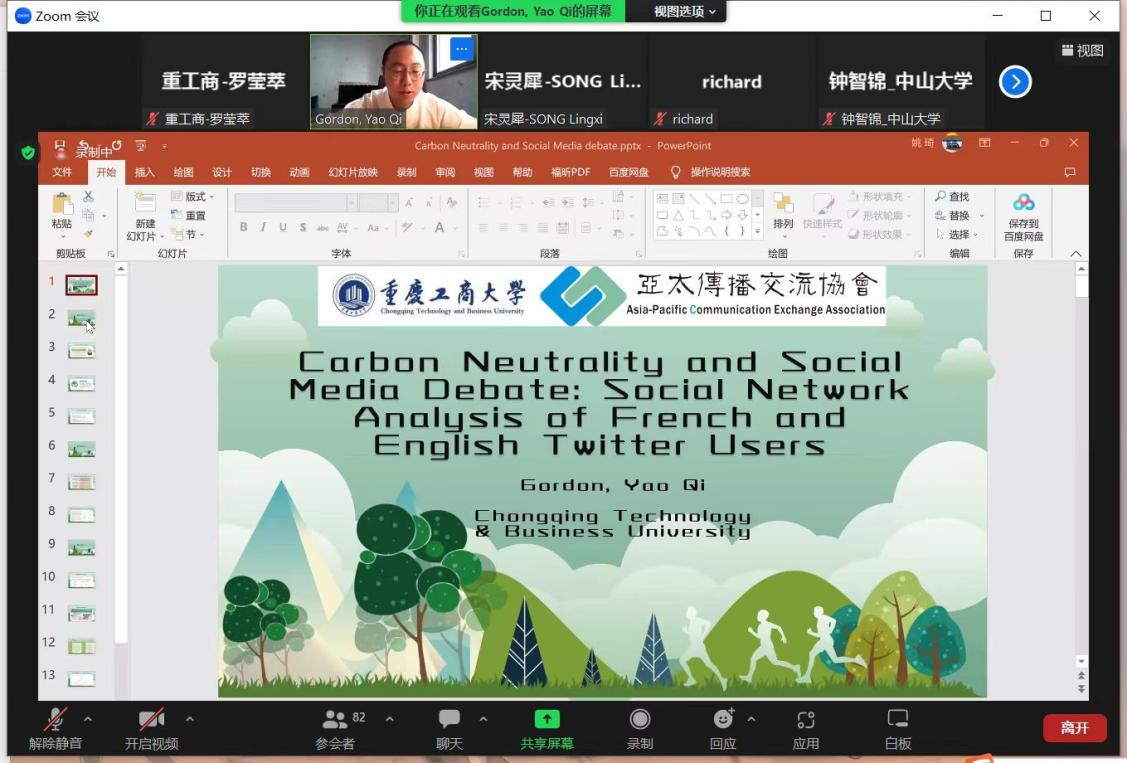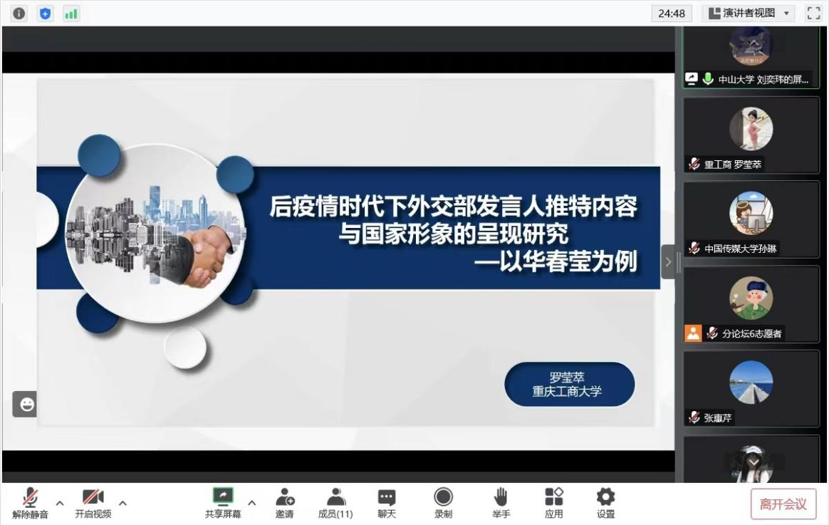 会议期间,王仕勇教授在两个分论坛中进行了点评和总结。姚琦博士担任此次论坛的主旨演讲人做了题为Carbon Neutrality and Social Media Debate:Social Network Analysis of French and English Twitter Users的发言,并主持两个分论坛。此外,公司四名研究生陈超、许珂、罗莹萃和曾朝婧在分论坛做了题为《量化的爱与可见的权力:粉丝圈群与算法的互动》、《被忽视的力量:积极网络舆论的要素、重要性与培育路径》、《后疫情时代下外交部发言人推特内容与国家形象的呈现研究》和《他者视阈下北京冬奥会的中国形象研究》的报告,向与会的各地区同行们展示了公司最新的研究成果,深化了学术交流,并引起了同行们的极大兴趣,获得广大与会代表的赞赏。