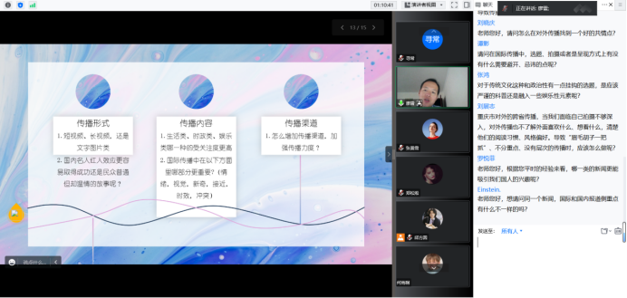 针对对外传播中国的选题,廖雷首先提出“不装大、不装老、不装小”三个要求,并结合《红高粱》等影视作品对外传播的案例进行了生动的说明。接下来,廖雷对对外传播的对象、形式、内容、价值和效能之间的关系进行了分析,强调了传播对象对传播效能的决定性作用,指出目标受众是影响选题的关键。最后,廖雷结合同学们提交的“讲好中国故事”选题,给出了“从不同处找相同”“从平凡处找不凡”“从落差中找中点”“从细节中显大义”四条建议。