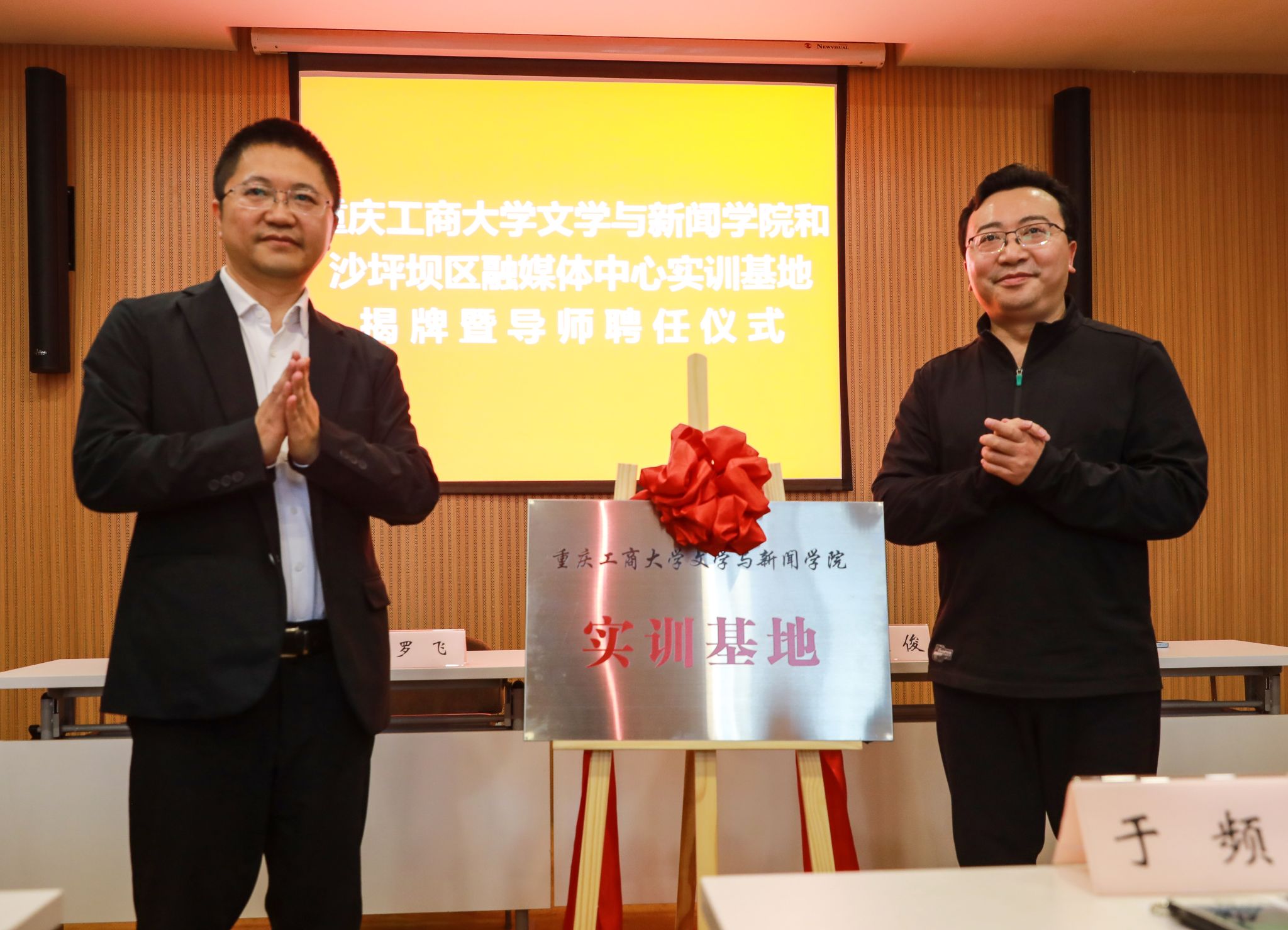 4月10日,tyc5997太阳集团和沙坪坝区融媒体中心举行实训基地揭牌暨导师聘任仪式。公司党委书记于频、经理殷俊、副书记程元元、副经理郑笑眉、新闻系系主任廖宇翃,沙坪坝区融媒体中心主任罗飞、副书记肖寒、副主任黄伟、冯剑、王小生等出席了揭牌仪式。