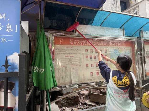 11月14日,在海棠溪海新街社区,志愿者们手持抹布、扫帚等清洁工具,用心擦拭了社区公示栏的每一个角落,使公示栏焕然一新。接下来,志愿者们又马不停蹄地投入到栏杆与展示牌的清洁工作中。他们分工协作、默契配合,有人负责打水、有人专注擦拭。大家的共同努力不仅让社区公共设施从“肮脏杂乱”蜕变为“干净整洁”,还有效处理了金属部件因潮湿、积尘而产生的锈蚀问题,延长了其使用寿命。