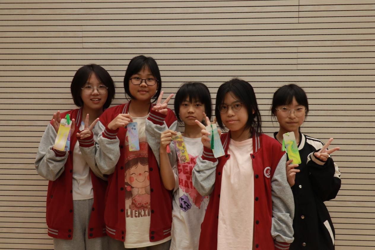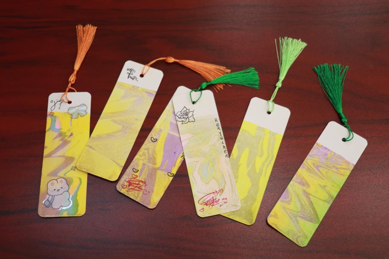 在志愿者的指导下,同学们自己动手制作漂漆书签。他们选取自己喜欢的漂漆颜色滴入水中,将空白书签缓缓浸入水中。待书签晾干,同学们手持画笔,小心翼翼地在书签上描绘出自己的专属图案。