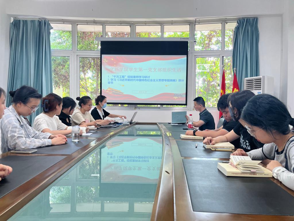 第二个议程是支部书记张小焕领学。张老师首先领学了主题教育专题学习资料《“千万工程”蕴含的科学思想与方法》。“千万工程”是习近平同志在浙江时亲自谋划、亲自部署、亲自推动的一项重大决策。经过20年的艰辛努力,造就了万千美丽乡村,造福了万千农民群众,成效显示,影响深远。张老师详细分析了“千万工程”所蕴含的科学思想与方法:调查研究成果的转化应用;理论与实践相结合的生动写照;人民至上的世界观方法论;坚持系统观念与系统方法;“一张蓝图绘到底”的战略定力。通过对思想与方法的分析,鼓励党员们认真学习新发展理念,为推动美丽中国建设贡献自己的力量。接着,张老师领学了《习近平新时代中国特色社会主义思想专题摘编》中的第二章部分内容:中国共产党领导是中国特色社会主义最本质的特征。带领党员原原本本读原著,悟原理,强调党员增强“四个意识”,自觉维护党中央权威和集中统一领导,自觉在思想上政治上行动上同党中央保持高度一致。